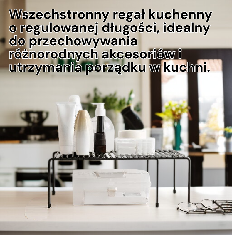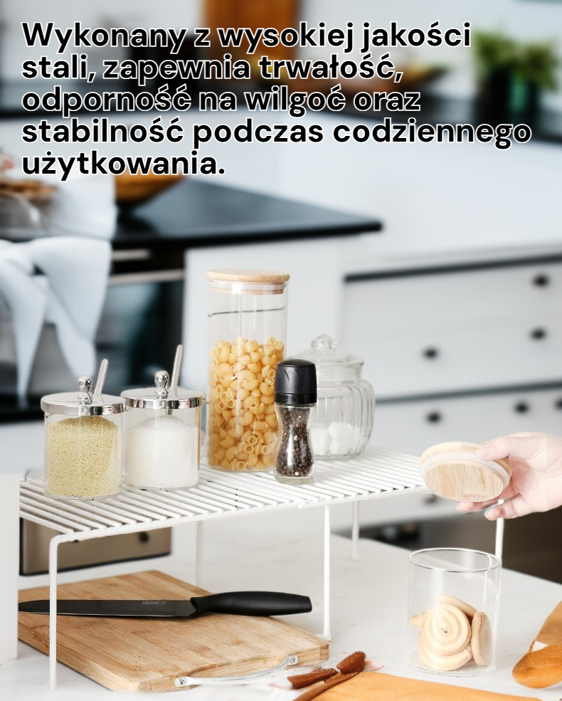 ● Wszechstronny regał kuchenny o regulowanej długości, idealny do przechowywania różnorodnych akcesoriów i utrzymania porządku w kuchni. ● Wykonany z wysokiej jakości stali, zapewnia trwałość, odporność na wilgoć oraz stabilność podczas codziennego użytkowania. ● Łatwy w montażu i demontażu, dzięki czemu można go szybko dostosować do różnych przestrzeni w szafkach lub na blatach. ● Wielofunkcyjny design umożliwia przechowywanie naczyń, produktów spożywczych, przypraw czy narzędzi kuchennych w jednym miejscu. ● Nowoczesny wygląd regału doskonale komponuje się z każdym stylem kuchni, dodając jej funkcjonalności i estetyki.